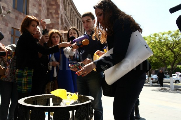 news.am.- Կառավարության դիմաց այսօր՝ ապրիլի 21-ին, «Հանուն օրենքի» նախաձեռնության անդամներն աղբամանի մեջ լցրեցին թուրքական արտադրության մի քանի ապրանքներ՝ կոչ անելով չգնել թուրքական արտադրության ապրանք եւ չհարստացնել Թուրքիային: