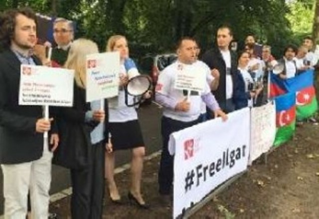 Ադրբեջանցի քաղաքական էմիգրանտների ու ակտիվիստների խումբը պաստառներ է պարզել ու բացականչել. «Ազատությո՛ւն Իլգար Մամեդովին», «Ազատությո՛ւն քաղբանտարկյալներին»։