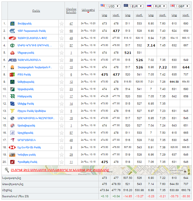 Ներկայացնում ենք Հայաստանի բանկերի կողմից գնվող և վաճառվող արտարժույթների փոխարժեքները հունիսի 24-ի դրությամբ` ըստ Rate.am–ի: