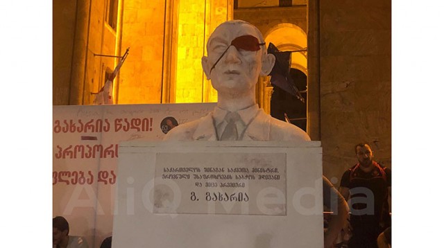 Թբիլիսիի Ռուսթավելի պողոտայում երեկ ցուցարարները բեմահարթակում տեղադրել են Վրաստանի ներքին գործերի նախարար Գիորգի Գախարիայի կիսանդրին՝ աչքին վիրակապ։ Այս մասին գրում է Aliq.ge-ն ու մանրամասնում, որ վիրակապը հիշեցում է, որ ցույցերի առաջին օրը բախումների հետևանքով վիրավորների թվում երկու մարդ կորցրել է աչքը, ընդ որում մեկը՝ երիտասարդ աղջիկը, ցույցերի հետ ընդհանրապես որևէ առնչություն չուներ, այլ ուղղակի վերադառնում էր գիշերային հերթափոխից: Հիշեցնենք, որ բազմամարդ ցույցերի գլխավոր պահանջը ներքին գործերի նախարարի հրաժարականն է , որը մինչ այժմ չի բավարարվել: