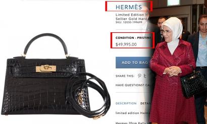 Թուրքիայի առաջին տիկին Էմինե Էրդողանը 50 000 դոլարանոց Birkin of Hermes պայուսակի պատճառով սկանդալի կենտրոնում է հայտնվել: Նրան այդ պայուսակով նկատել են նախագահ Ռեջեփ Թայիփ Էրդողանի հետ Ճապոնիա այցի ժամանակ, հաղորդում է Cumhuriyet-ը: Պարբերականը նշում է, որ 50 000 դոլարը (ավելի քան 288 000 թուրքական լիրա) կազմում է Թուրքիայում նվազագույն աշխատավարձ ստացող 11 անձի համար տարեկան եկամուտը: «Չնայած քաղաքացիները պայքարում են գների բարձրացման դեմ, պալատը չի հրաժարվում ճոխությունից»,- գրում է պարբերականը՝ նկատի ունենալով նախագահական պալատը 1150 սենյակներով, որը կառուցվել էր Էրդողանի կողմից 2014թ., երբ նա նախագահ ընտրվեց: Թուրքիան փորձում է ուշքի գալ արժութային ճգնաժամից, ինֆլյացիայի եւ գործազրկության բարձր մակարդակի հետ կապված խնդիրներից: Էրդողանի ընտանիքին ու նրա շրջապատին քննադատում են ճոխ ապրելակերպի համար: 2017 թվականին Թուրքիայի նախագահական բյուրոն հայտարարություն տարածեց՝ ի պատասխան Էրդողանի չափազանց մեծ քանակով ծախսերի մասին՝ հայտարարելով, որ տնտեսությունը չպետք է վարվի ի վնաս հեղինակության:
