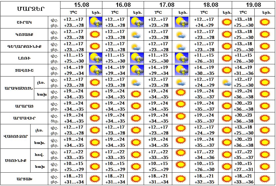 Արտակարգ իրավիճակների նախարարությունը տեղեկացնում է, որ օգոստոսի 15-17-ը Շիրակում, Լոռիում, Տավուշում օրվա երկրորդ կեսին և գիշերվա առաջին կեսին սպասվում է կարճատև անձրև և ամպրոպ, ամպրոպի ժամանակ‵ քամու ուժգնացում‵ 15-20 մ/վրկ արագությամբ: