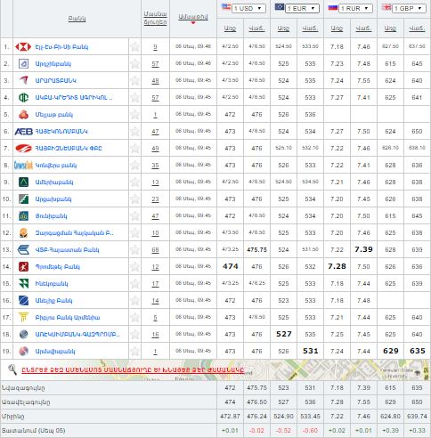 Ներկայացնում ենք Հայաստանի բանկերի կողմից գնվող և վաճառվող արտարժույթների փոխարժեքները սեպտեմբերի 6-ի դրությամբ՝ ըստ Rate.am-ի: