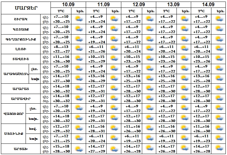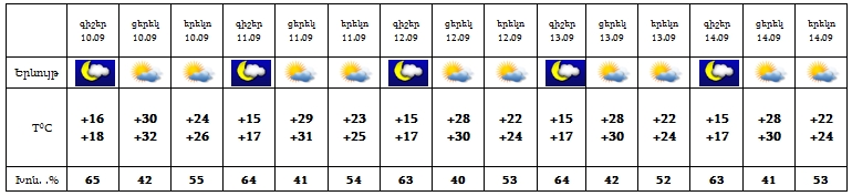 Արտակարգ իրավիճակների նախարարությունը տեղեկացնում է, որ սեպտեմբերի 10-14-ը սպասվում է առանց տեղումների եղանակ: Քամին՝ արևմտյան՝ 3-8 մ/վ արագությամբ: