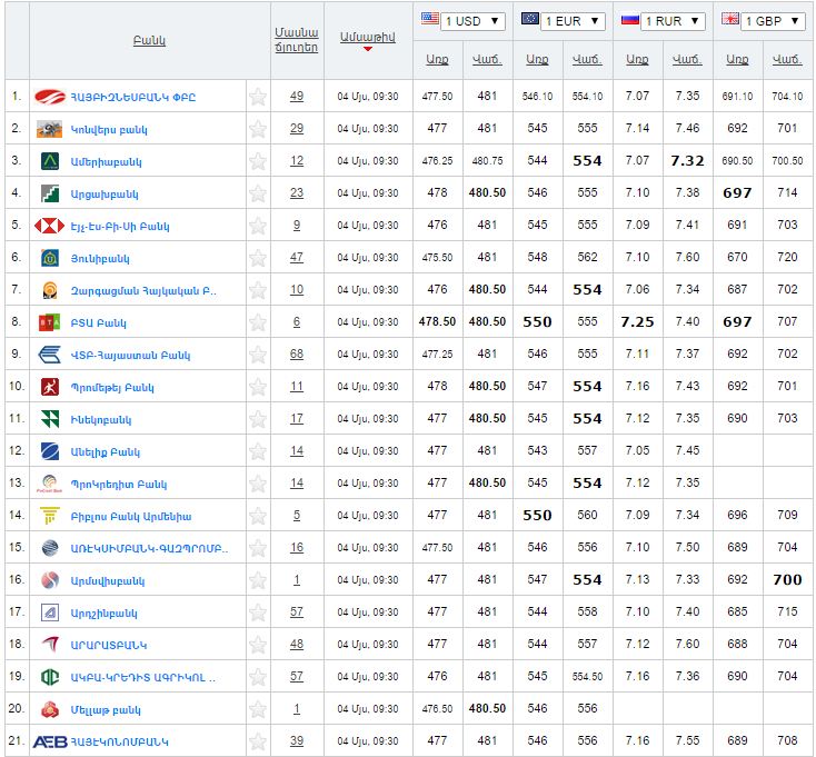 Ներկայացնում ենք ՀՀ ռեզիդենտ բանկերի կողմից արտարժույթների համար սահմանված փոխարժեքները: