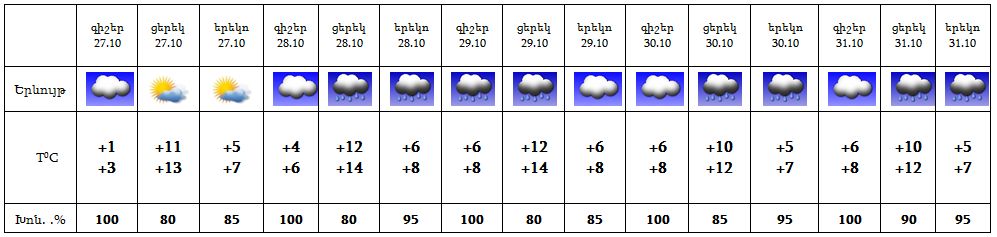 Հոկտեմբերի 27-ին, 28-ի գիշերը սպասվում է առանց տեղումների եղանակ: 28-ին կեսօրից հետո, 29-31-ը սպասվում են տեղումներ, լեռնային գոտիներում` թաց ձյուն:
