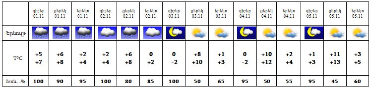 Նոյեմբերի 1-2-ը ժամանակ առ ժամանակ սպասվում է անձրև, նոյեմբերի 3-4-ը սպասվում է առանց տեղումների եղանակ: