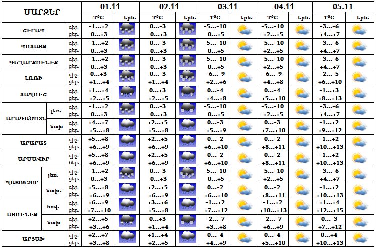 Նոյեմբերի 1-2-ը հանրապետությունում սպասվում են առատ տեղումներ, լեռնային և նախալեռնային գոտիներում՝ հիմնականում ձյան տեսքով, առանձին ճանապարհահատվածներում սպասվում է բուք, ցածր տեսանելիություն և մերկասառույց: Նոյեմբերի 2-ի լույս 3-ի գիշերը Տավուշի և Սյունիքի հովտային գոտիներում, Արագածոտնի և Վայոց ձորի նախալեռներում, Արարատյան դաշտում հնարավոր է 0-2 աստիճան ցուրտ: