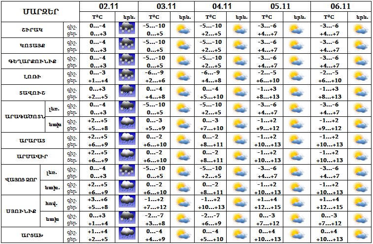 Նոյեմբերի 2-ին ժամանակ առ ժամանակ սպասվում է անձրև, նոյեմբերի 3-6-ը սպասվում է առանց տեղումների եղանակ: