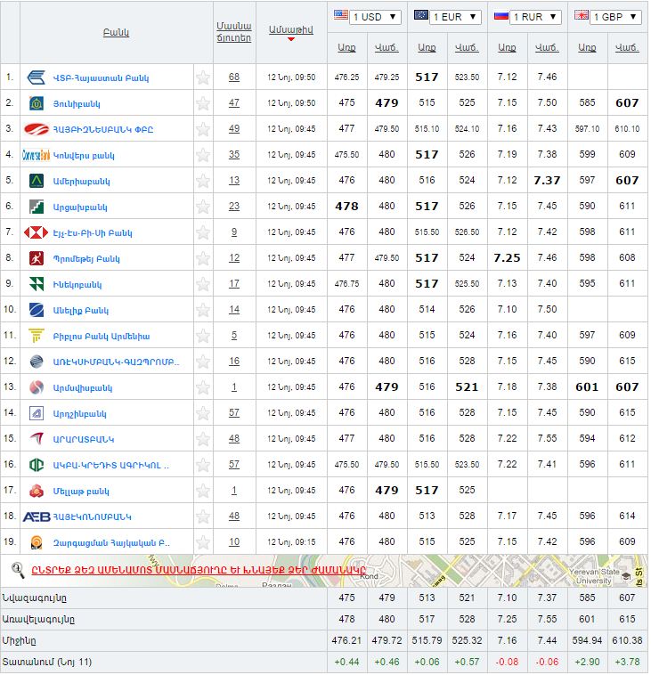 Ըստ Rate.am–ի՝ հայաստանյան առևտրային բանկերում նոյեմբերի 12-ին արտարժույթը վաճառվում է հետևյալ փոխարժեքներով։