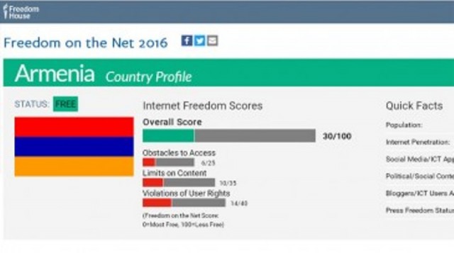 Freedom House միջազգային կազմակերպության կողմից հրապարակվել է «Համացանցի ազատությունը 2016 թ-ին» զեկույցը, որտեղ աշխարհի 67 երկրներում գնահատվել է համացանցի ազատության մակարդակը: