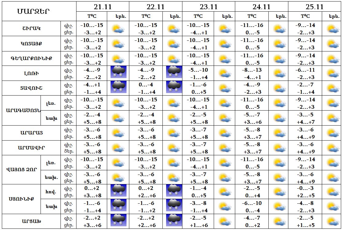 նոյեմբերի 21-22-ը Լոռիում, Տավուշում, Սյունիքում և Արցախում սպասվում է թույլ ձյուն և մառախուղ: