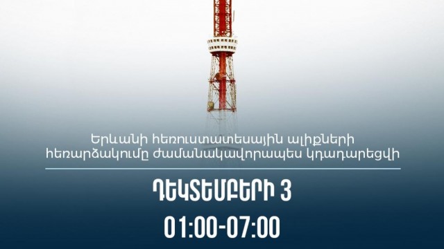 Դեկտեմբերի 3-ին՝ ժամը 01։00-07։00-ն ընկած ժամանակահատվածում, Երևանի հեռուստատեսային ալիքների հեռարձակումը ժամանակավորապես կդադարեցվի։