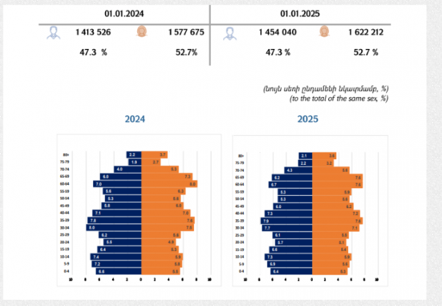 ԱՎԿ-ն ներկայացրել է 2025թ.-ի հունվարի 1-ի դրությամբ ՀՀ-ում ապրող մշտական բնակչության սեռատարիքային հարաբերակցությունը, ըստ որի՝ 1 454 040-ը արական սեռի ներկայացուցիչներ են՝ 47.3 տոկոսը, իսկ 1 622 212-ը՝ իգական, որը կազմում է բնակչության 52.7 տոկոսը։ Նշենք, որ վերջին՝ 2024 թ.-ի տվյալներով բնակչության թվաքանակը ՀՀ-ում կազմում է 3 076 200 մարդ։