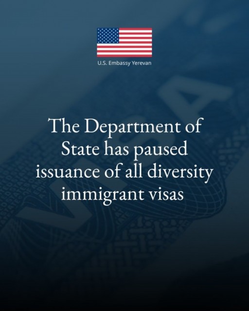 Երևանում ԱՄՆ դեսպանատունը տեղեկացնում է. «ԱՄՆ պետքարտուղարությունը կասեցրել է ներգաղթային մուտքի արտոնագրերի տրամադրումը բազմազանության արտոնագրի (գրին քարտ) խաղարկության շրջանակում։ Մենք ժամանակ և անհրաժեշտ միջոցներ կտրամադրենք ԱՄՆ ազգային ու հասարակական անվտանգությունը պաշտպանելու համար։ DV-2027 ծրագրի վերաբերյալ այս պահին նոր հայտարարություններ առկա չեն։ Հավելյալ տեղեկությունների համար այցելեք հետևյալ հղմամբ»։