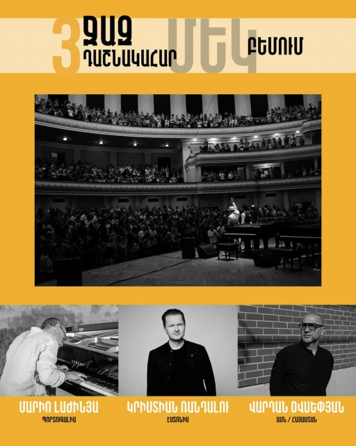 Տևական ընդմիջումից հետո երևանյան համերգասրահ է վերադառնում «Երեք դաշնակահար՝ մեկ բեմում» բացառիկ նախագիծը, որն իր շուրջ է համախմբել հայ և օտարազգի բարձրակարգ երաժիշտների։ Դաշնակահարներ Վարդան Օվսեփյանը (ԱՄՆ/Հայաստան), Մարիո Լաժինյան (Պորտուգալիա), Կրիստիան Ռանդալուն (Էստոնիա) մայիսի 17-ին «Արամ Խաչատրյան» համերգասրահում կկատարեն ականավոր կոմպոզիտորների գործեր՝ ջազային մեկնաբանությամբ։ Գաղափարի հեղինակ Թովմաս Մարտիրոսյանի խոսքով՝ նախագծի առաջին համերգը տեղի է ունեցել 2014 թվականին։ Երաժիշտներ Արմեն Բաբախանյանը, Վահագն Հայրապետյանը և Տիգրան Համասյանը հանդես են եկել «Հայ դաշնամուրային երաժշտություն» խորագրով համերգով։