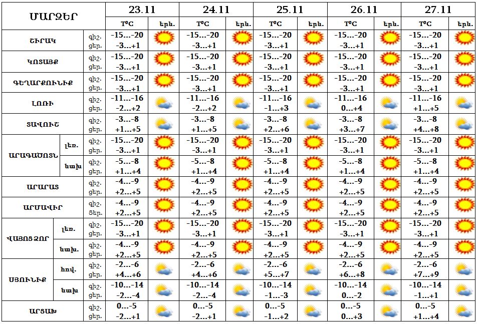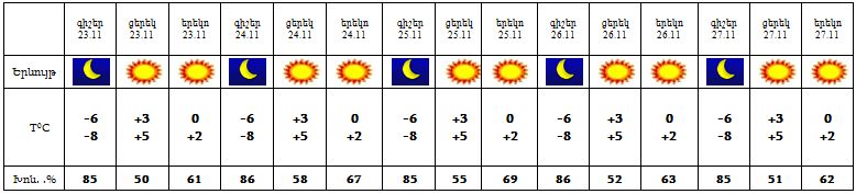 Քամին՝ հյուսիս-արևելյան՝ 3-8 մ/վ արագությամբ: Օդի ջերմաստիճանը նոյեմբերի 23-ի գիշերը կնվազի 2-3 աստիճանով, այնուհետև էապես չի փոխվի: