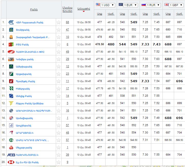 Ներկայացնում ենք ՀՀ ռեզիդենտ բանկերի կողմից արտարժույթների համար սահմանված փոխարժեքները` ըստ Rate.am–ի: