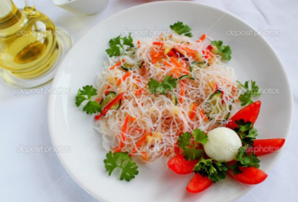 Բաղադրիչները՝ - 200 գ թափանցիկ բրնձի լապշա - 3 հատ. Բուլղարական պղպեղ տարբեր գույների - 1 հատ թարմ վարունգ - 2 հատ գազար - 3 պճեղ սխտոր - Բուսայուղ - 2 թ/գ քացախ - աղ - Սոյայի սոուս Պատրաստման եղանակը՝ Լապշան լցրեք սառը ջրի մեջ ու թողեք 10 րոպե, քամեք սառը ջուրը , որից հետո վրան լցրեք եռման ջուր և 5 րոպե հետա այն քամեք ու լվացեք հոսող ջրի տակ և թողեք քամվի: Գազարն ու պղպեղը բարակ շերտերով կտրատեք, համեմեք այն բուսայուղով ու տապակեք այնքան, միչև որ փափկի, սակայն ուշադիր եղեք, որ պղպեղը իր գույնը չկորցնի: Սխտորը մանր կտրատեք, գազարն ու պղպեղը տապակեք ու վերջում ավելացրեք մանրացված սխտորը: Երբ տապակած սխտորը, պեղպեղն ու գազարը կսառչեն, խառնեք այն լապշայի ու վարունգի հետ: Ավելացրեք քացախ, սոյայի սուս ու աղ: Աղբյուրը՝ coocook.me