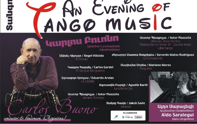 ՀՀ մշակույթի նախարարության, ՀՀ-ում Արգենտինայի դեսպանության և «Կոնվերս Բանկի» աջակցությամբ, Հայաստանի ազգային ֆիլհարմոնիկ նվագախմբի տնօրինությունը՝ ս. թ. մայիսի 27-ին, ժամը 19:00-ին, Արամ Խաչատրյան համերգասրահում կանցկացնի Արգենտինական տանգոյի երաժշտության և պարերի երեկո: Իր ձևաչափով աննախադեպ այս նախագծի շրջանակում Հայաստանի ազգային ֆիլհարկոմիկ նվագախումբը կհյուրընկալի հանրաճանաչ արգենտինացի բանդոնեոնահար Կարլոս Բուոնոյին, ում ղեկավարությամբ էլ կկատարվեն արգենտինական տանգոյի երաժշտության գեղեցիկ նմուշներ՝ նվագախմբի լարային կազմի և արգենտինացի դաշնակահար Ալդո Սարալեգիի նվագակցությամբ: Համերգի ընթացքում կհնչեն Աստոր Պիացոլլայի, Յակոբ Գադեի, Մարիանո Մորեսի, Անխել Վիյոլդոյի, Էդուարդո Արոլասի, Կարլոս Գարդելի, Ագուստին Բարդիի, Ժերարդո Մատոս Ռոդրիգեսի ստեղծագործությունները: Տանգոյի պարային համարներով հանդես կգան Արիաննա Կաոիլին, Սուրեն Մխիթարյանը, Արկադի Ատասունցովը և Դիաննա Հայրապետյանը: Համերգը նվիրվում է հայ-արգենտինյան բազմամյա համագործակցությանը: