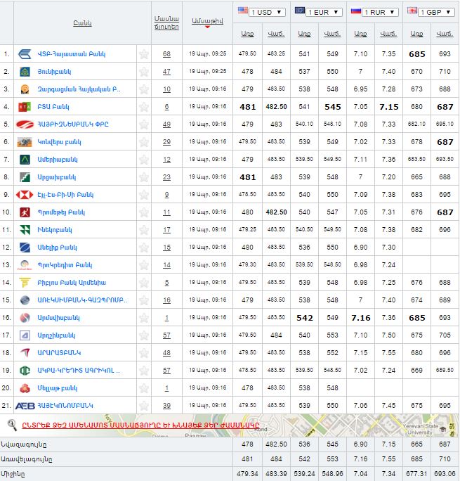 Ներկայացնում ենք ՀՀ ռեզիդենտ բանկերի կողմից սահմանված փոխարժեքներն ապրիլի 19-ի դրությամբ: