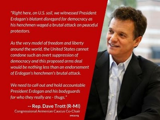 ԱՄՆ Կոնգրեսի հայկական հարցերով աջակցության խմբի համանախագահներ Դեյվ Թրոթն ու Ֆրենք Փալոնեն նամակ են հղել պետքարտուղարությանը՝ կոչ անելով չեղարկել Թուրքիայի նախագահ Ռեջեփ Թայիփ Էրդողանի թիկնապահներին ատրճանակներ վաճառելու գործարքը։ Այս մասին հաղորդում է Հայ դատի ամերիկյան հանձնախումբը (ANCA)։