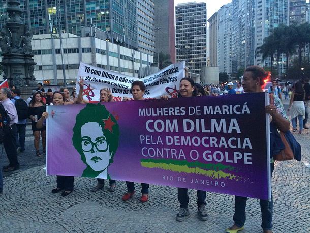 Одним из самых популярных лозунгов митинга стала фраза "Путчисты, фашисты, шовинисты!", адресованная новому правительству Бразилии. Демонстранты критиковали кабинет министров, который сформировал Темер, за отсутствие в нем женщин и обвиняли и.о. президента в дискриминации слабого пола и притеснении малоимущих слоев населения. Через несколько часов после начала акции к собравшимся присоединилась и сама Руссефф, специально приехавшая в Рио-де-Жанейро для общения со сторонниками.