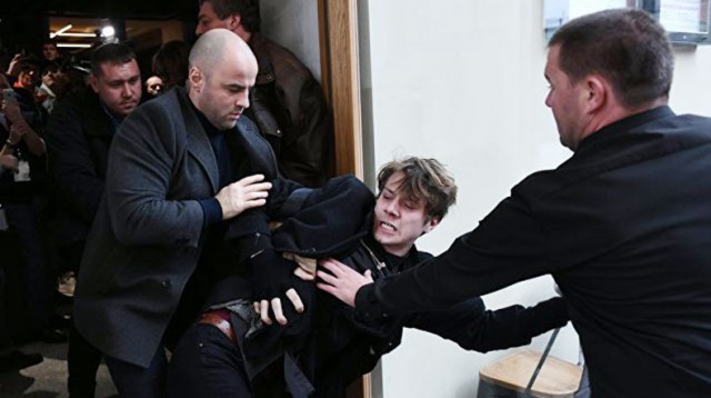 Մոսկվայում հաղորդավարուհի Քսենիա Սոբչակի մամուլի ասուլիսի ժամանակ, ով հայտարարել էր 2018 թ. մարտին Ռուսաստանի նախագահական ընտրություններին մասնակցելու իր ծրագրերի մասին, դահլիճ է մտել անհայտ մի տղամարդ և հայտարարել, որ ցանկանում է հարց տալ: