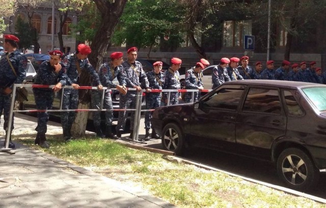Մելիք Ադամյան փողոցի վրա գտնվող ՀՀԿ կենտրոնական գրասենյակը երկու կողմից վերցված է ոստիկանական պատնեշի մեջ։ Այստեղ կանգնած է եւ երթեւեկությունը եւ չկա անցուդարձ։ Այս պահին կարմիր բերետովորները՝ թվով 100 հոգի, հսկում են ՀՀԿ գրասենյակը։