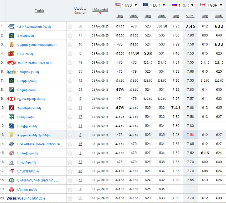 Ըստ Rate.am–ի՝ հայաստանյան առևտրային բանկերում արտարժույթը վաճառվում է հետևյալ փոխարժեքներով։