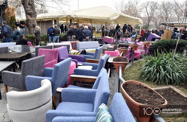 Օպերայի հարակից տարածքի սրճարանների ապամոնտաժման աշխատաքներին զուգահեռ քաղաքապետարանի աշխատակիցները տեղափոխում են այդ տարածքում գտնվող թփերը: