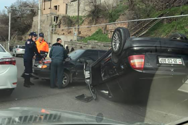 Միմյանց բախվելուց հետո ավտոմեքենաներից մեկը գլխիվայր շուռ էր եկել ու գրեթե ամբողջապես փակել փողոցը: