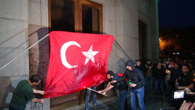 Երևանի Ազատության հրապարակում ավանդական Ջահերով երթի մեկնարկից առաջ այրեցին Թուրքիայի դրոշը։