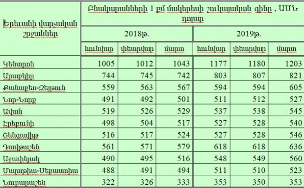 Այդ ժամանակահատվածում Հայաստանում օտարերկրյա քաղաքացիները վաճառել են շուրջ 366 բնակարաններ (երկրում բնակարանների ընդհանուր վաճառքի 10.1 տոկոսը): Իսկ նրանց կողմից ձեռք են բերվել գրեթե երկու անգամ պակաս թվով բնակարաններ՝ 197 բնակարան (երկրում բնակարանների ընդհանուր գնման 5.4 տոկոսը): Ավելի վաղ ենթադրվում էր, որ օտարերկրացիների մի մասը մեր հայրենակիցներն են, որոնք փոխել են քաղաքացիությունը: Մայրաքաղաքում բնակարանների առաջնային շուկայի պահանջարկը խթանվում է պետական ծրագրերի միջոցով, որոնք տրամադրում են քաղաքացիների հիպոթեքային արտոնություններ: Որպես կանոն նոր բազմաբնակարան շենքերը ներկայումս կառուցվում են ոչ մայրաքաղաքի էլիտար կենտրոնում: Այսինքն՝ Հյուսիսային պողոտայի նման նախագծեր բնակարանների չափազանց բարձր գներով արդեն կարծես չեն նախատեսվում: Անցյալ տարի Երեւանում շահագործման էր հանձնվել 63 բնակելի շենք, որոնք կառուցվել էին կազմակերպությունների հաշվին: Դա բավականին գերազանցել է նախորդ տարվա ցուցանիշը, երբ շահագործման էր հանձնվել ընդամենը 4 շենք: Հաշվի առնելով բնակարանների մեծ առաջարկը (ինչպես առաջնային, այնպես էլ երկրորդային շուկայում), գնորդներն ընտրելու խնդիրներ չունեն: Սպառման խնդիրներ ունեն միայն անշարժ գույք վաճառող անձինք: Այդ պայմաններում հակասական են պաշտոնական տվյալները, որոնք վկայում են մայրաքաղաքում բնակարանների շուկայական գների անդադար աճի մասին: Այդ առումով առանձնանում է Կենտրոն վարչական շրջանը, որտեղ 1ք/մ մակերեսը տարվա ընթացքում թանկացել է 17 տոկոսով: Ներքոնշյալ աղյուսակում ներկայացված է գների դինամիկան դոլարով բնակարանի 1 ք/մ մակերեսի համար: Նշենք, որ ընթացիկ տարվա հունվար-մարտ ամիսներին ԱՄՆ-ի դոլարի փոխարժեքը աննշան կրել է փոփոխություն: