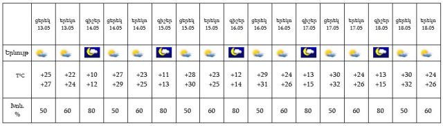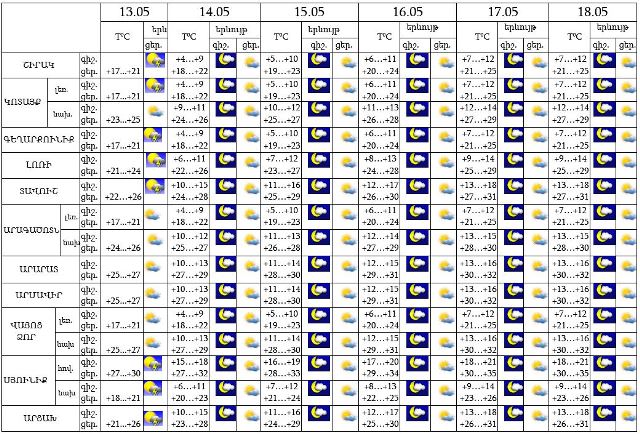 Մայիսի 13-ին առանձին շրջաններում, կեսօրից հետո սպասվում է կարճատև անձրև և ամպրոպ, առանձին վայրերում հնարավոր է կարկուտ։ Մայիսի 14-18-ը սպասվում է առանց տեղումների եղանակ:Քամին՝ հարավային՝ 3-8 մ/վ, ամպրոպների ժամանակ սպասվում է քամու ուժգնացում՝ 15-20 մ/վ: