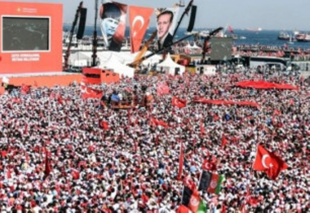 Թուրքիայի նախագահ Ռեջեփ Թայիփ Էրդողանը զինվորականների կողմից հեղաշրջման անհաջող փորձից հետո ազգային համախմբվածությունը, միասնականությունը և ուժը ցուցադրելու նպատակով Ստամբուլում զանգվածային հանրահավաք է կազմակերպել, որին ժամանել է ուղղաթիռով կնոջ՝ Էմինե Էրդողանի հետ։