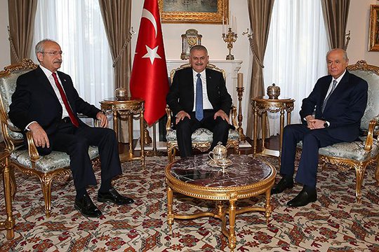 Թուրքական Son dakika լրատվական կայքի փոխանցմամբ՝ Թուրքիայի վարչապետ, իշխող «Արդարություն ու զարգացում» կուսակցության (ԱԶԿ) նախագահ Բինալի Յըլդըրըմը «Չանքայա» նստավայրում հանդիպել է խորհրդարանում ներկայացված մյուս երեք ուժերից երկուսի՝ «Ժողովրդահանրապետական» կուսակցության (ԺՀԿ) և «Ազգայնական շարժում» կուսակցության (ԱՇԿ) առաջնորդներ Քեմալ Քըլըչդարօղլուի ու Դևլեթ Բահչելիի հետ:
