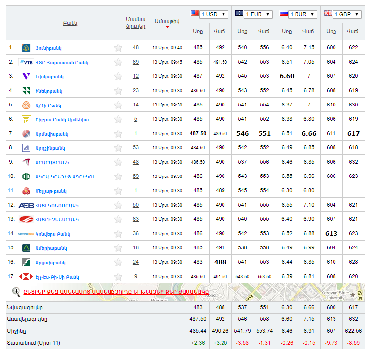 Ներկայացնում ենք Հայաստանի բանկերի կողմից գնվող և վաճառվող արտարժույթների փոխարժեքներ մարտի 13-ի դրությամբ՝ ըստ rate.am-ի: