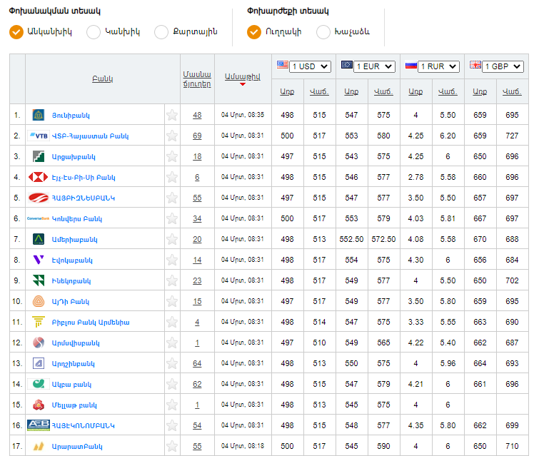 Tert.am-ը ներկայացնում է Հայաստանի բանկերի կողմից գնվող և վաճառվող արտարժույթների փոխարժեքները մարտի 3-ի դրությամբ՝ ըստ rate.am-ի: