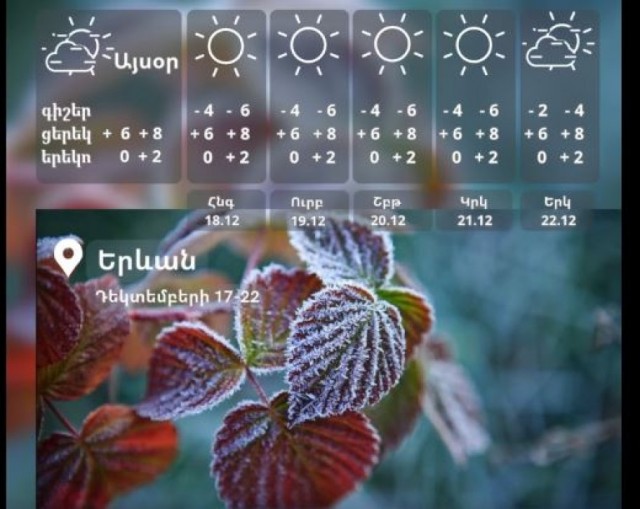 Երևանում դեկտեմբերի 17-ի ցերեկը, 18-22-ին սպասվում է առանց տեղումների եղանակ։