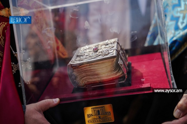 Կիրակի առավոտյան Մաշտոցյան Մատենադարանից Շուրիշկանի Ավետարանն անցնում է Արագածոտնի թեմից եկած քահանաներին։ Արագածոտնի թեմում այս ավանդույթը 26 տարի առաջ է ձևավորվել։ Այսօր էլ ավանդույթը չխախտվեց։ Թեմի առաջնորդ Տեր Մկրտիչ եպիսկոպոս Պռոշյանի օգնությամբ Սուրբ Գևորգ եկեղեցու հոգևոր սպասավոր Տեր Եղիշե քահանա Բարսեղյանը և Ապարանի Սուրբ Խաչ եկեղեցու հոգևոր հովիվ Տեր Նարեկ քահանա Սարգսյանը Սուրբ Գևորգ եկեղեցի տեղափոխեցին հրաշագործ Ավետարանը։ Մուղնի ուխտի եկածները խանդավառությամբ դիմավորեցին Սուրբ Գիրքը։ Շուրիշկանի Ավետարանի առկայությամբ Սուրբ Պատարագը մատուցեց Մայր Աթոռի Քարոզչական կենտրոնի տնօրեն Հոգեշնորհ Տ․ Զաքարիա ծայրագույն վարդապետ Բաղումյանը։ Շուրիշկանի հրաշագործ Ավետարանը Սուրբ Գևորգ եկեղեցում կմնա մինչև 16։00-ը, այնուհետև դարձյալ կտեղափոխվի Մատենադարան։