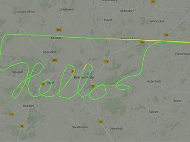 Մասնավոր օդանավի օդաչուն Գերմանիայի երկնքում օդանավի հետագծով պատկերել է Hello բառը։ Guardian պարբերականը հայտնում է, որ 37 րոպեանոց թռիչքի արդյունքը կարելի է տեսնել Flightradar 24 կայքում, որը հետեւում է օդային երթեւեկություններին, փոխանցում է Lenta–ն։
