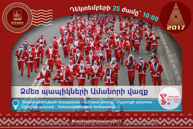 Ձմեռ պապի հանդերձանքով հարյուրավոր վազորդները «Վազիր և օգնիր» կարգախոսով մայրաքաղաքի կենտրոնական հատվածներում կվազեն շուրջ 5 կմ: Արդեն ավանդական դարձած Ամանորի և Սուրբ ծննդյան տոներին նվիրված վազքարշավը կմեկնարկի Հանրապետության հրապարակից: