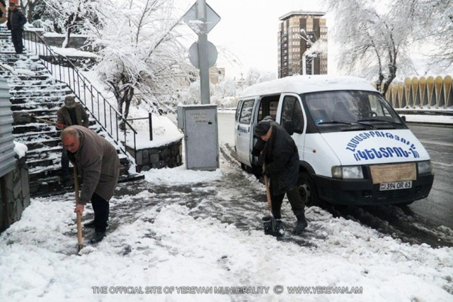 «Սանիթեք» ընկերության և Երևանի վարչական շրջանների կոմունալ ծառայությունների մեքենասարքավորումներով մայրաքաղաքում շարունակվում են ձնամաքրման աշխատանքները, ինչպես նաև հեռացվում են հասարակական և բնակելի շենք-շինությունների տանիքներից կախված սառցալեզվակները: Այս տարվա աշխատանքային առաջին խորհրդակցության ժամանակ քաղաքապետ Տարոն Մարգարյանը նշել էր, որ դրանց անհրաժեշտությունն առավել զգալի է երկրորդական փողոցներում, մայթերին, բակերում և միջբակային տարածքներում: Նշված հատվածների մաքրմանը ներգրավված են նաև համատիրությունների աշխատակիցները, ովքեր անհրաժեշտության դեպքում աղ ու ավազի խառնուրդ էլ են օգտագործում: Տեղերում աշխատանքների ընթացքը վերահսկում են վարչական շրջանների ղեկավարները, Երևանի քաղաքապետարանի կոմունալ տնտեսության վարչությունը և օպերատիվ շտաբը:
