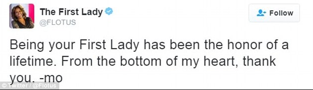 «Ձեր առաջին տիկինը լինելը կյանքիս մեծագույն պատիվն էր: Ի սրտե շնորհակալ եմ»,-մեջբերում է The Daily Mail-ը Միշել Օբամայի գրառումը՝ հավելելով, որ դրան կից առաջին տիկինը հրապարակել է իր և ամուսնու՝ գործող նախագահ Բարաք Օբամայի գրկախառնված լուսանկարը: