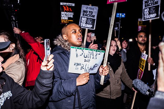 Ցուցարարները երթով անցել են Լոնդոնում ԱՄՆ դեսպանատան մոտից մինչև Թրաֆալգար հրապարակ՝ բացականչելով «Կամուրջներ կառուցեք, ոչ թե պատեր»: Ցուցարարներից ոմանց ձռքին եղել են պաստառներ «Կանգնեցրեք Թրամփին», «Մերժենք ատելությունը, շտկենք քաղաքականությունը», «Ոչ ռասիզմին, ոչ Թրամփին» գրություններով: Նրանց են միացել նաև Բրիտանիայի մայրաքաղաքի քաղաքապետ Սադիք Խանը, բրիտանացի դերասանուհի Ռեբեկա Հոլը, լեյբորիստական կուսակցությունից պատգամավորներ Իվետ Կուպերը և Հարիեթ Հարմանը: Կազմակերպիչների տվյալներով՝ ակցիային մասնակցել է մոտ 80 000 մարդ: