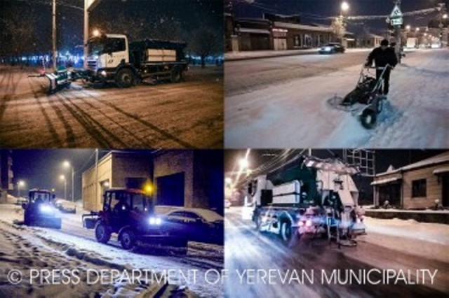 Չդադարող ձյան պայմաններում «Սանիթեք» ընկերության, մայրաքաղաքի վարչական շրջանների կոմունալ ծառայությունների մեքենասարքավորումներով ողջ գիշեր ընթացել և այժմ էլ շարունակվում են ձնամաքրման աշխատանքները: Հատուկ տեխնիկան հիմնականում կենտրոնացված է գլխավոր ու երկրորդական փողոցների ձնամաքրմանը: Մաքրվող բոլոր տարածքներն ըստ անհրաժեշտության մշակվում են աղի և ավազի խառնուրդով, իսկ բակային տարածքների ձնամաքրմանը վաղ առավոտից ներգրավված են նաև համատիրությունների աշխատակիցները: Տեղերում աշխատանքների ընթացքը վերահսկում են վարչական շրջանների ղեկավարները, Երևանի քաղաքապետարանի կոմունալ տնտեսության վարչությունը և օպերատիվ շտաբը: Չդադարող ձյան ռեժիմով իրականացվող աշխատանքների արդյունքում մայրաքաղաքում փակ փողոցներ չկան: