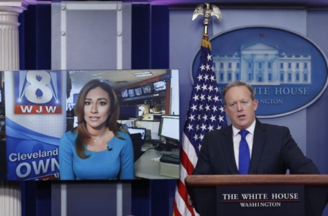 Չորեքշաբթի Սպիտակ տան պաշտոնական ներկայացուցիչ Շոն Սփայսերին հարցեր են ուղղել ոչ միայն այն լրագրողները, որոնք եղել են ճեպազրույցների համար նախատեսված սենյակում, այլև նրանք, ովքեր հետևել են ճեպազրույցին Skype-ի միջոցով։