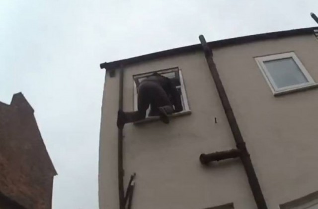 Փրկարարներից 20 րոպե է պահանջվել տղամարդուն պատուհանից իջեցնելու և օրինապահներին հանձնելու համար: 47-ամյա Շոն Քրոշոուն խոստովանել է, որ փորձել է կողոպտել բնակարանը: Դատարանը վերջինիս դատապարտել է 2 տարի 5 ամսվա ազատազրկման: