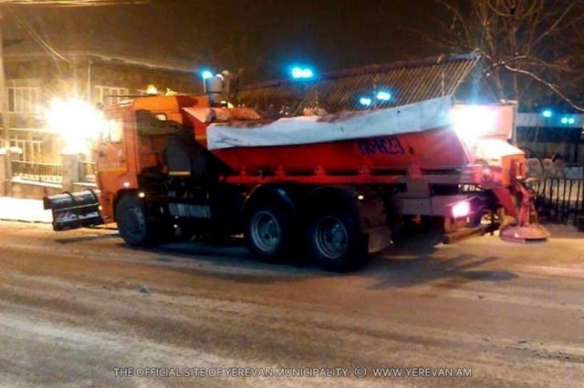 Վաղ առավոտից մայրաքաղաքում տեղացող թույլ ձյան հետևանքով փողոցների երթևեկելի հատվածներում, ջերմաստիճանի անկումով պայմանավորված, հնարավոր մերկասառույցի առաջացումը կանխելու նպատակով օրվա ընթացքում իրականացվել և շարունակվում են ձնամաքրման և աղի ու ավազի խառնուրդով մշակման աշխատանքները: Գործընթացն իրականացվում է «Սանիթեք» ընկերության և Երևանի վարչական շրջանների կոմունալ ծառայությունների մեքենասարքավորումներով: Սրան զուգահեռ իրականացվում է նաև գլխավոր փողոցների մայթերի ձնամաքրում և աղ ու ավազի խառնուրդով մշակում: